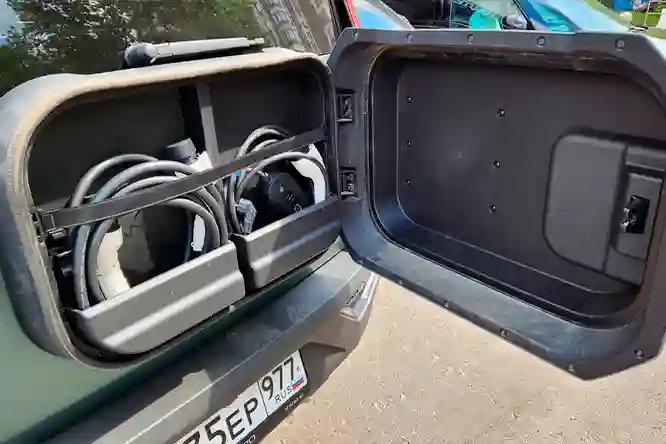 Сам багажник тоже немного удивляет. От такого крупного автомобиля подспудно ждешь чего-то большего. Объем производитель не указывает, но отсек тут не больше, чем у какого-нибудь среднеразмерного кроссовера. Пол получился высоким, а за откидной крышкой прячется 12-вольтовый аккумулятор и небольшой набор инструментов. Запасного колеса нет.