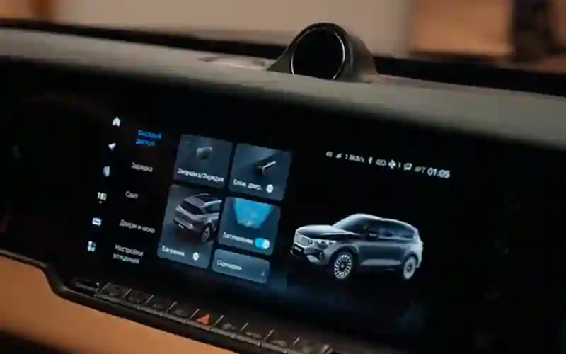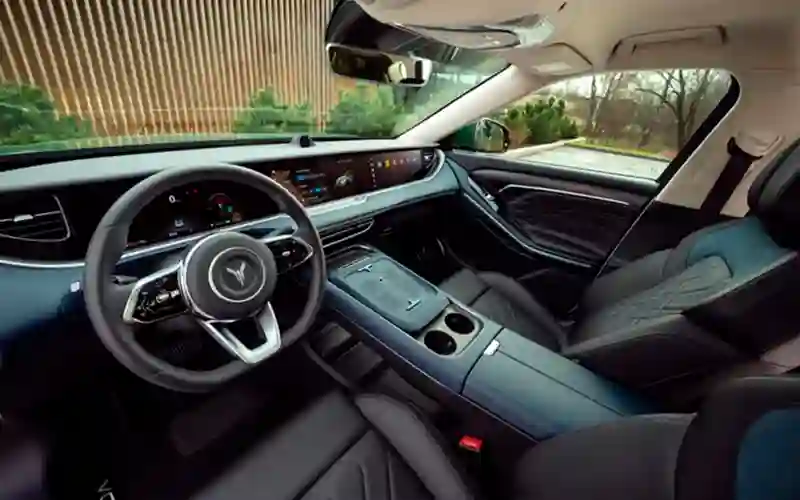 Передняя панель снабжена тремя 12,3-дюймовыми дисплеями под общим стеклом. Левый — это приборная панель, центральный — управление мультимедиа, а правый — развлекательный комплекс для пассажира, который можно отключить, если он не нужен. Приборная панель позволяет выбирать из нескольких вариантов отображения. Любопытно, что часть торпедо, в которую встроены дисплеи, может менять свое положение: при запуске автомобиля она поднимается, а при закрытии опускается — выглядит максимально эффектно. Также предусмотрен сенсорный дисплей для пассажиров второго ряда.