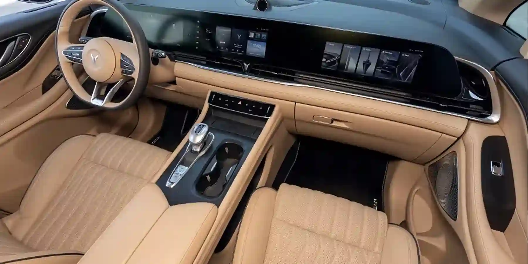 В салоне Voyah аж три экрана по 12,3 дюйма каждый: электронная приборная панель, основной дисплей комплекса и еще один специально для переднего пассажира.