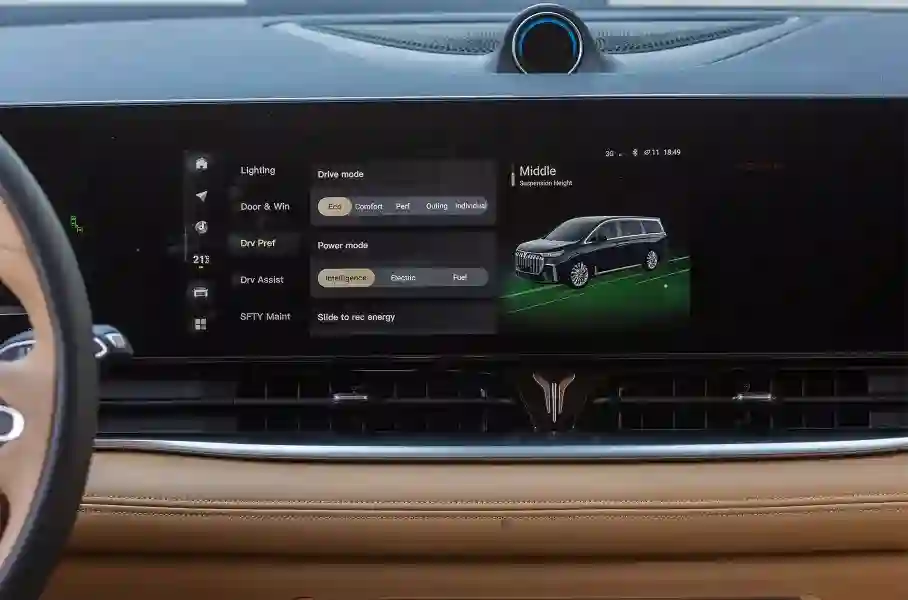 Отсюда можно регулировать климат-контроль (в том числе на втором ряду), управлять музыкой, навигацией и настройками сидений, смотреть видео (как с внешнего носителя, так и из Сети), включать внутрисалонную камеру и делать селфи, а также, если бы мы находились в Китае, даже бронировать гостиницы и заказывать еду на вынос.
